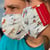 - Halten Sie die Maske am oberen und unteren Ende fest und platzieren Sie sie über Nase und Mund. Ziehen Sie die Bänder über die Ohren und spannen Sie die Maske so an, dass es keine Lücken zwischen Maske und Gesicht mehr gibt