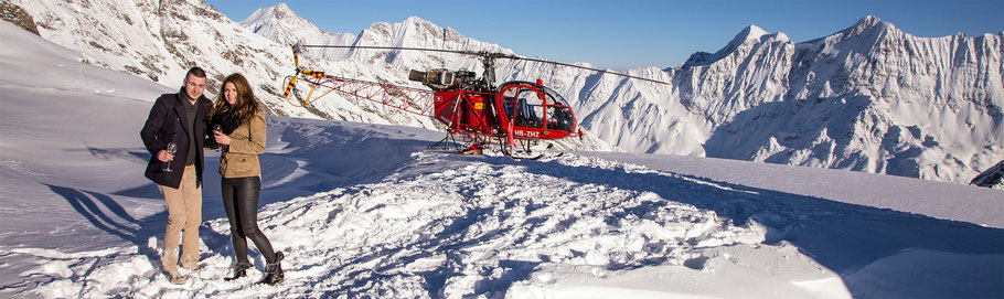 Nach einem eindrücklichen Alpenrundflug landen Sie mit dem Helikopter auf dem Clariden-Hüfifirn Gletscher. Hier auf Eis und Schnee, inmitten der herrlichen Schweizer Alpenlandschaft, servieren